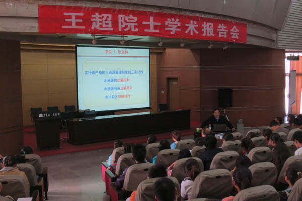 王超院士以《实行水功能区限制排污的核心科技问题》为题,详细介绍了全国水功能区的内涵、作用、划分原则、划分方法以及水功能区限制排污红线的主要内容和发展历程,着重介绍了全国水功能区划中解决的理论难题以及一系列关键技术。王院士从自己的科研实践出发,对如何将学术思想转变为政府、社会的具体实施向当代大学生、研究生以及青年教师提出了殷切的希望。王院士的报告语言简练易懂,内容详实精彩,全场先后六次响起热烈的掌声,得到在座师生的一致好评。在报告结束后,王院士还介绍了河海大学环境学院管理、学生培养以及科研创新等方面的成就和经验。