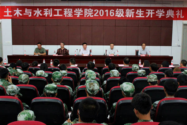 2016级新生开学典礼在怀远校区研究生楼二楼报告厅举行。典礼由学办主任郭利老师主持。学院党委书记马正亮老师、院长毛明杰老师、党委副书记王德全老师、副院长刘海峰老师、工会主席杨明成老师、土木工程系主任金宝宏老师、水利工程系主任李王成老师、建筑城规系主任燕宁娜老师、交通工管系主任张学科老师、学办主任陈艳老师、教科办主任白俊英老师、实验室主任刘登川老师、研究生办公室秘书马轶老师、学院团委书记王娜老师、2016级辅导员陶雪梅老师、优秀教师代表张文博老师、2015级辅导员马小凤老师出席。全体2016级本科生、研究生参加此次开学典礼。