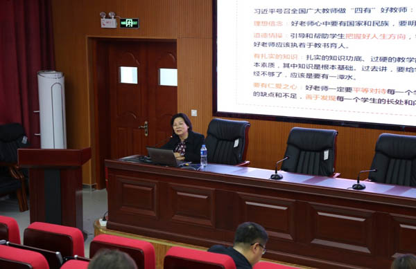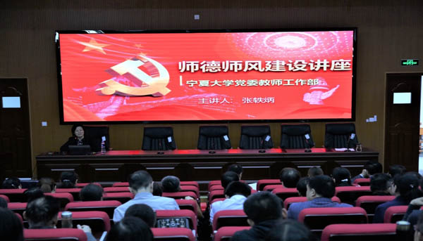张教授从古今中外对师德师风基本内涵的理解认识,结合对习近平总书�2018�5�2日在北京大学的重要讲话和2018�9�10日在全国教育大会上的重要讲话精神的学习领会,重点阐述了坚持立德树人、强化教师队伍建设的重要性。她详细解读了《教育部关于建立健全高校师德建设长效机制的意见》和《新时代高校教师职业行为十项准则》等师德师风建设相关文件精神,同时对教育部《十项准则》与《宁夏大学师德失范行为处理办法(试行)》进行了对照说明。生动的讲座使与会教职工加深了对师德师风建设重要意义、重点工作的理解,进一步牢记肩负的历史使命和职责,进一步明确师德师风和教师职业道德的底线、红线、高压线。对全面贯彻全国高校思想政治工作会议精神,全面加强学院师德师风建设工作都具有十分重要的指导意义�