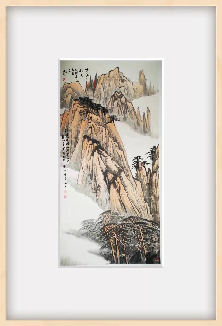 这幅名为《黄山秋色》的作品,清新自然、意境宽广、饱含深情。秋日里的黄山云雾缭绕,挺拔的迎客松若隐若现,宛如仙境。岿然不动的山川寓意着经历了艰苦卓绝的斗争,中华民族和中国人民将以更加威武的姿态屹立于世界民族之林。“绿水青山就是金山银山。”——习近平总书记如是说。这秀丽的大好河山正是全国各族人民在中国共产党坚强领导下,在生态文明建设中取得巨大成就的真实写照�