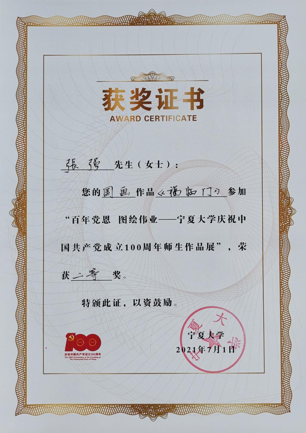 “百年党� 图绘伟业—宁夏大学庆祝中国共产党成立100周年师生作品展”二等奖