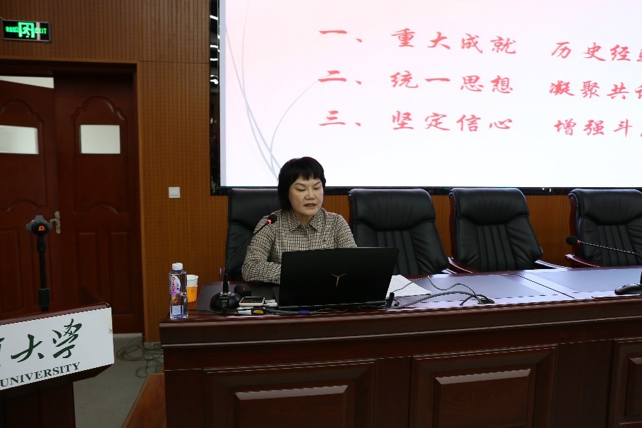 主题宣讲结束后,学院党委副书记尹娟对周萍老师所做的精彩报告表示感谢,并做了总结发言。她强调,全体师生要在党史学习教育学习成果基础上,继续认真学习贯彻党的十九届六中全会精神,通过开展形式多样的主题活动交流和研讨学习心得,不断加深认识、深化理解,并把党的十九届六中全会精神实实在在的体现在我们教书育人、立德树人工作当中。各位教师要通过课程思政的方式,把我们学到的、领会到的精神实质、思政知识元素、先进的思想传授给我们的青年学生,真正实现为党育人、为国育才,为培养时代新人、推动教育事业高质量发展贡献自己的一份力量。