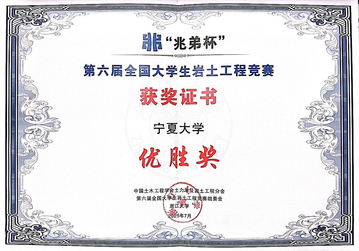 由我校土木与水利工程学院武立波老师指导,李鑫、崔子龙、李瑞三位同学组成的宁夏大学代表队凭借扎实的专业素养和出色的团队协作,在初赛、复赛中脱颖而出,最终斩获大赛优胜奖,实现了我校在该项赛事中奖项零的突破,展现了我校在岩土工程领域的教学水平和学生创新能力。