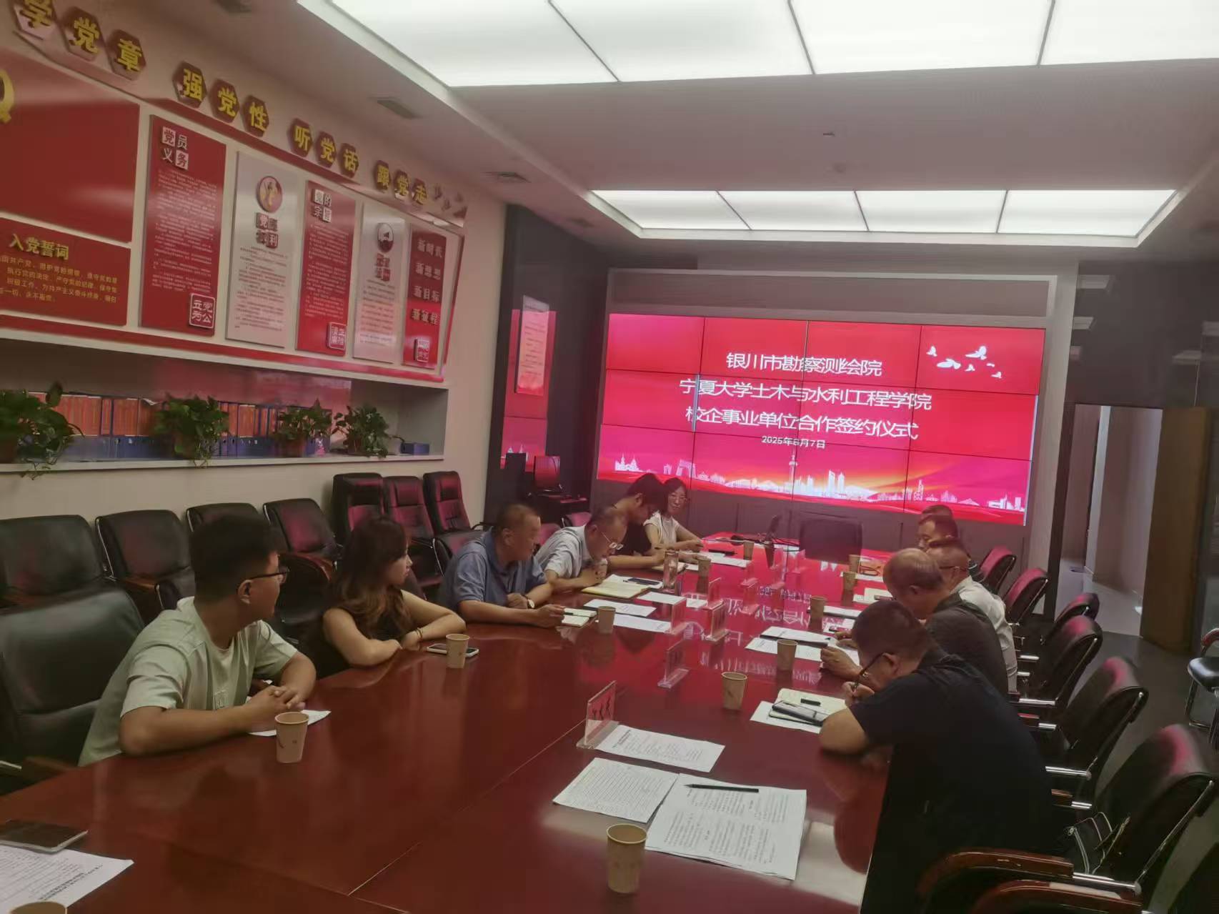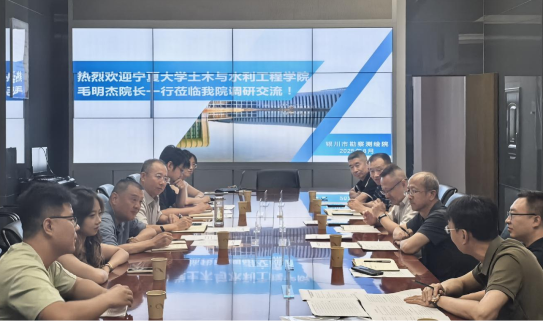 2025年8月8日,宁夏大学土木与水利工程学院院长毛明杰率队赴银川市勘察测绘院开展深度交流座谈,宁夏测绘院院长董军率领导班子成员接待毛明杰院长一行,会议在银川市自然资源局一号会议室举行,双方聚焦人才培养、技术协作与产学研融合,共绘校企合作发展蓝图。