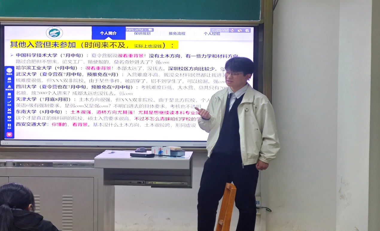 保研至浙江大学的曾天赐,围绕“投入与产出是否对等”、“保研与考研的差异”等问题展开讲解,帮助同学们明确未来发展方向。他系统梳理了本专业的保研去向,并推荐了相关院校与学习方法,使在场同学收获颇丰。