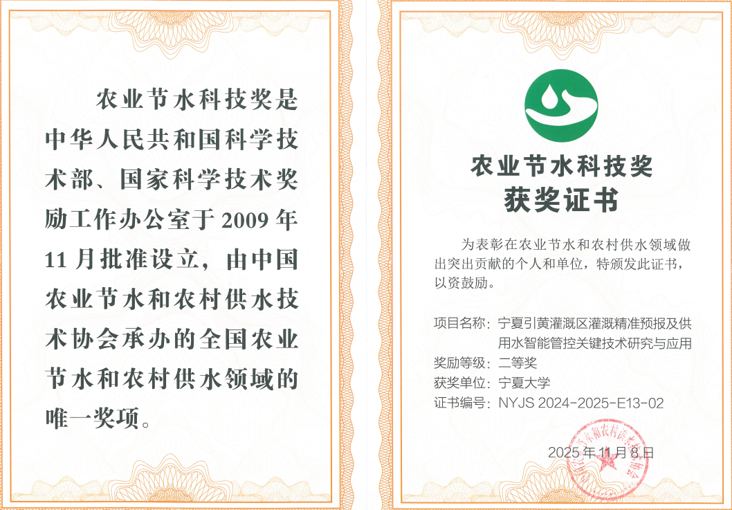 11月8日至9日,2024-2025年度(第十届)农业节水科技奖颁奖大会在广州隆重举行。由我校作为第二完成单位、土木与水利工程学院朱磊教授作为我校牵头人,徐利岗教授、丁一民副教授为主要技术骨干参与完成的“宁夏引黄灌区灌溉精准预报及供用水智能调控关键技术设备研究与应用”项目,荣获二等奖。该成果充分体现了我校在智慧水利与数字农业交叉领域的科研实力与创新贡献。