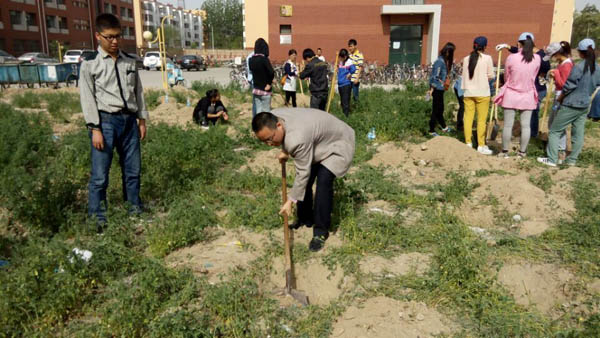 绿化植树活动在C区15号公寓楼前进行。参与本次植树活动的有学院党委副书记张强老师、学办主任郭利老师、团委书记王娜老师和兼职辅导员韩东,学院2014级全体男生、青马班和发展对象培训班学员共300余名同学参加。