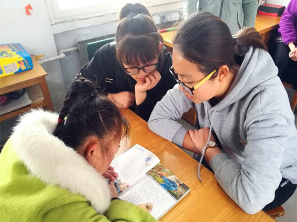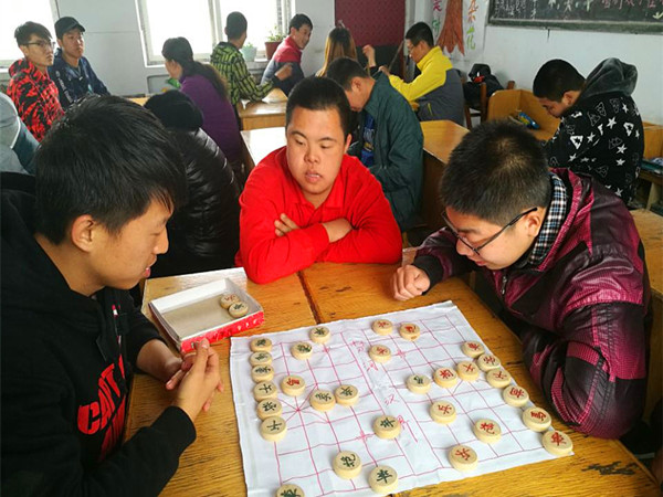的,就知道又是哥哥姐姐来看他们了,开心地又鼓起掌。在几个志愿者帮助家园打扫陈列室的同时,其他志愿者耐心地陪伴这些孩子。吴忠涛喜欢写字,他有自己的纸笔,写起字来开心的不得了,我让他来给我们看看,他一笔一划的默写《三字经》。一位志愿者和他玩起了三字经接龙,他竟然对答如流;不写字的时候他会指着墙上的宣传报刊念念有词。他们对象棋的兴趣不小,不时还有各种可爱的提问,陪他们玩的志愿者耐心讲解其中道理。有个小姑娘很爱唱歌,志愿者就找出了她喜欢的《明天,你好》,其中有句歌词很应景:时间它总说慌,我从不失去那些肩膀……