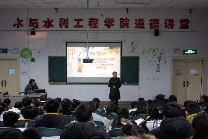 团委学生会在知行楼三阶隆重举行了2017学年秋季学期团委学生会述职测评报告会。学院党委副书记柳松洁老师、学院团委书记蒋宇欢老师、学生工作办公室陶雪梅老师、何进宇老师、马小凤老师出席了本次会议,团委学生会全体成员参加了本次会议。此次会议由7名主席团成员以及来自14个部门的代表进行了述职报告,对于本学期的学生工作进行总结、反思,通过述职提升学生干部的综合素质。