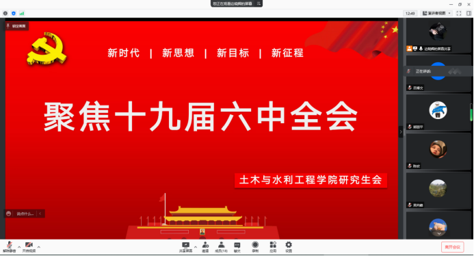 土木与水利工程学院研究生会积极响应号召,迅速掀起学习热潮,研会执行主席边晓辉积极组织研会全体成员开展了以“聚焦十九届六中全会”为主题的线上会议�