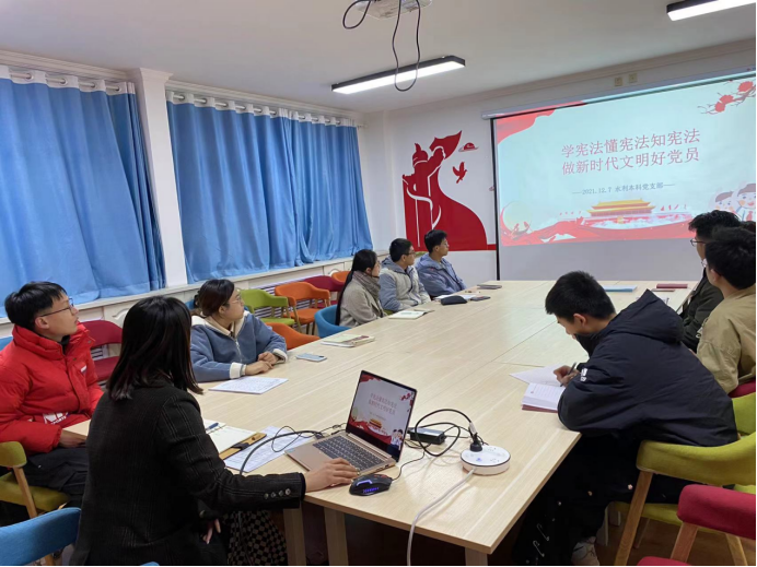 12�7日,水利本科党支部在党员活动室召开了主题为“学宪法 懂宪� 知宪法,做新时代文明好党员”专题学习研讨会,党支部全体成员参加,会议由党支部书记梁冀宁主持�