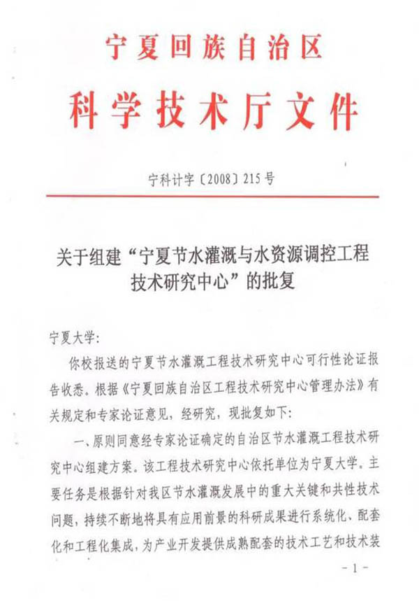 为了充分发挥宁夏大学学科、设备和人才优势,考虑到节水灌溉在宁夏的重要地位,宁夏大学较早地将节水灌溉理论与技术、水资源调控、结构工程新材料列为“水利水电工程”博士点和硕士点、自治区重点学科、“节水灌溉与水资源调控”�211”工程重点建设学科的重要学科方向进行培育,在组建成立 “宁夏大学节水灌溉与水资源调控工程技术研究中心”的基础上,申报成功“宁夏节水灌溉与水资源调控工程技术研究中心”。本中心具有节水灌溉、农艺、企业管理及市场营销等学术水平高、工程化经验丰富的工程技术带头人和工程技术研究开发人才;并与区内外近30个科研院所、企业以及技术推广部门有着十分密切的合作和协作关系;具有培养、集聚高层次工程研究技术人才的能力和技术培训条件,基本具备了节水灌溉研发的实验条件、基础设施和设备条件�