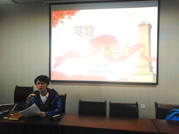在知行楼五楼508会议室举办第七期发展对象培训班第四场报告,此次报告主讲人为土木本科党支部书蒋宇欢老师,题目为《英雄,永不独行》。本期全体发展对象学院及土木本科党支部全体成员聆听了此次报告。